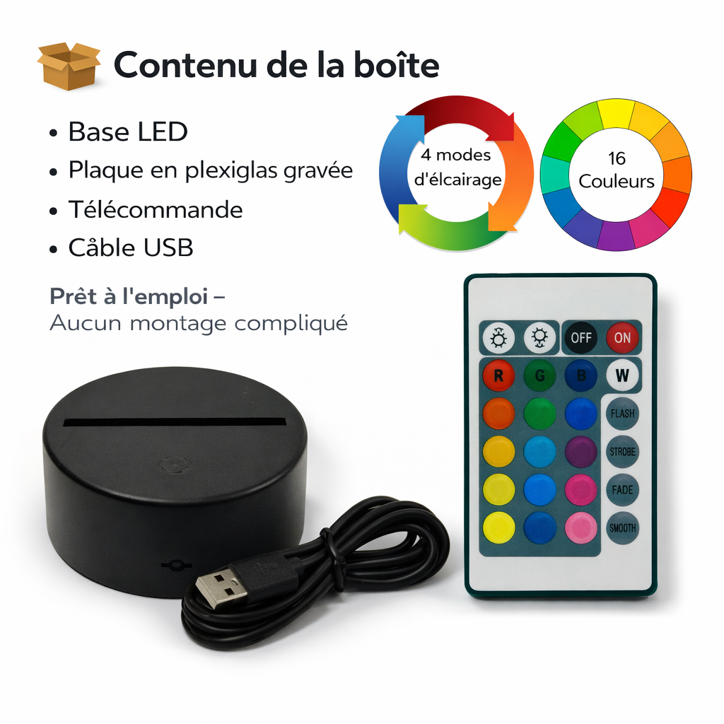 - 1 base led + 1 plaque gravée + 1 télécommande + 1 câble USB + 1 notice